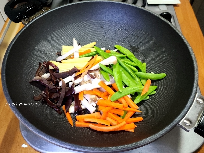因為玉米荀與甜豆較不易熟,千千媽咪會在鍋中放入少許的水後去拌炒,加快熟度。